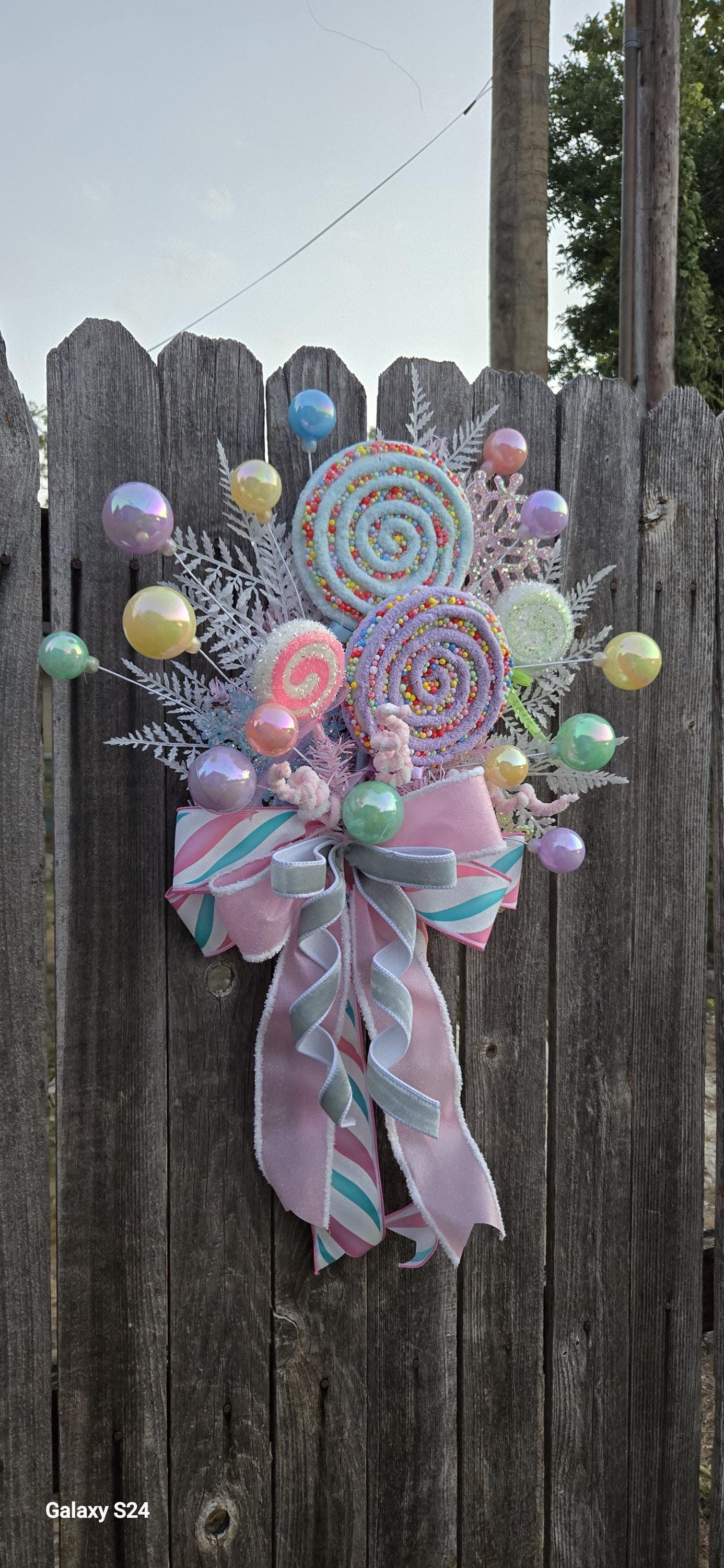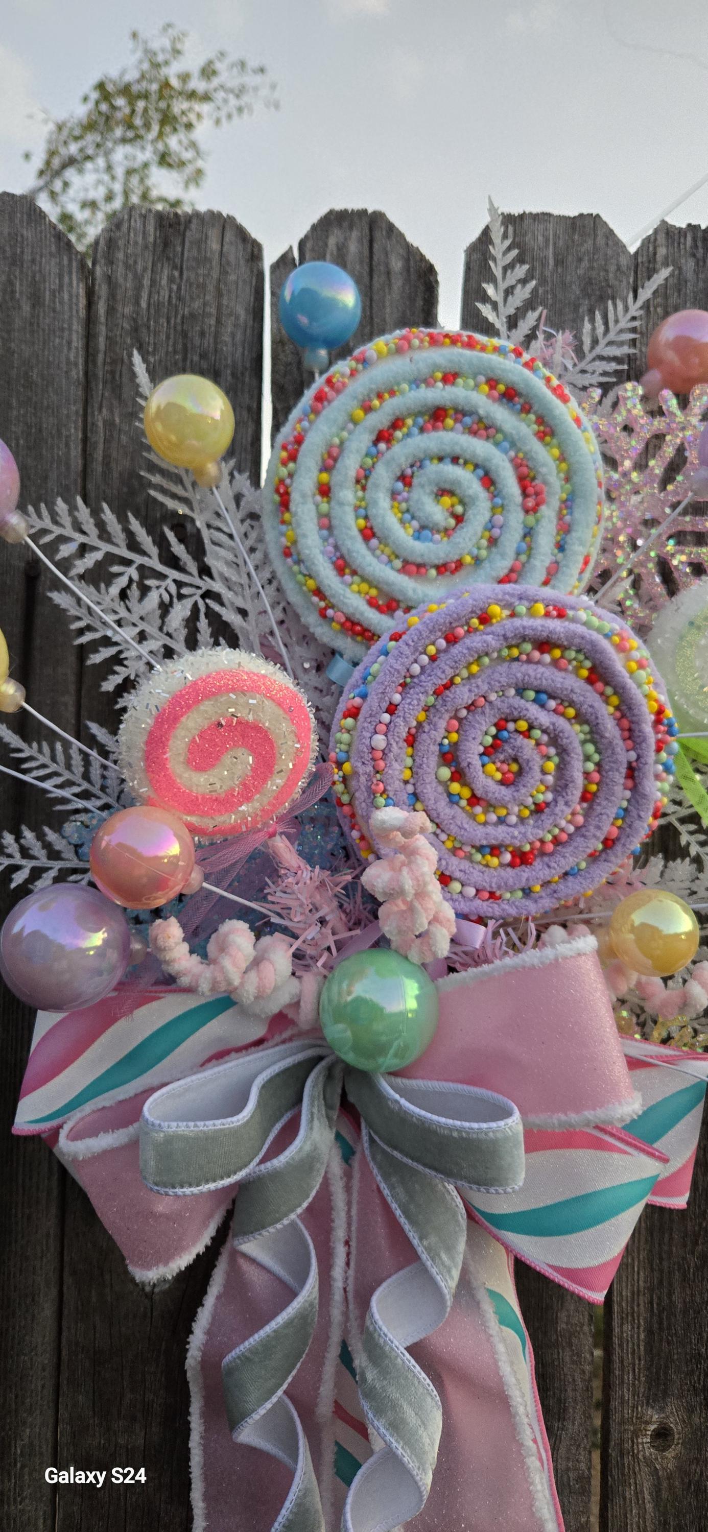 This tree topper is ready to be placed on your tree.. filled with lollipops and ball ornaments in beautiful pastel colors and finished with a large bow made with premium ribbon. Pre-assembled and easy to install.