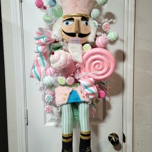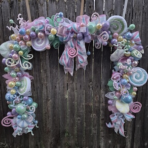 Bring a touch of whimsical magic to your holiday decor with this oversized Candyland-inspired snowman decoration! Measuring an impressive 37 inches high by 26 inches wide, this plush snowman head is topped with a glittery pastel-striped top hat and surrounded by a delightful mix of swirled lollipops, iridescent ornaments, sparkling snowflakes, and pastel ribbons.