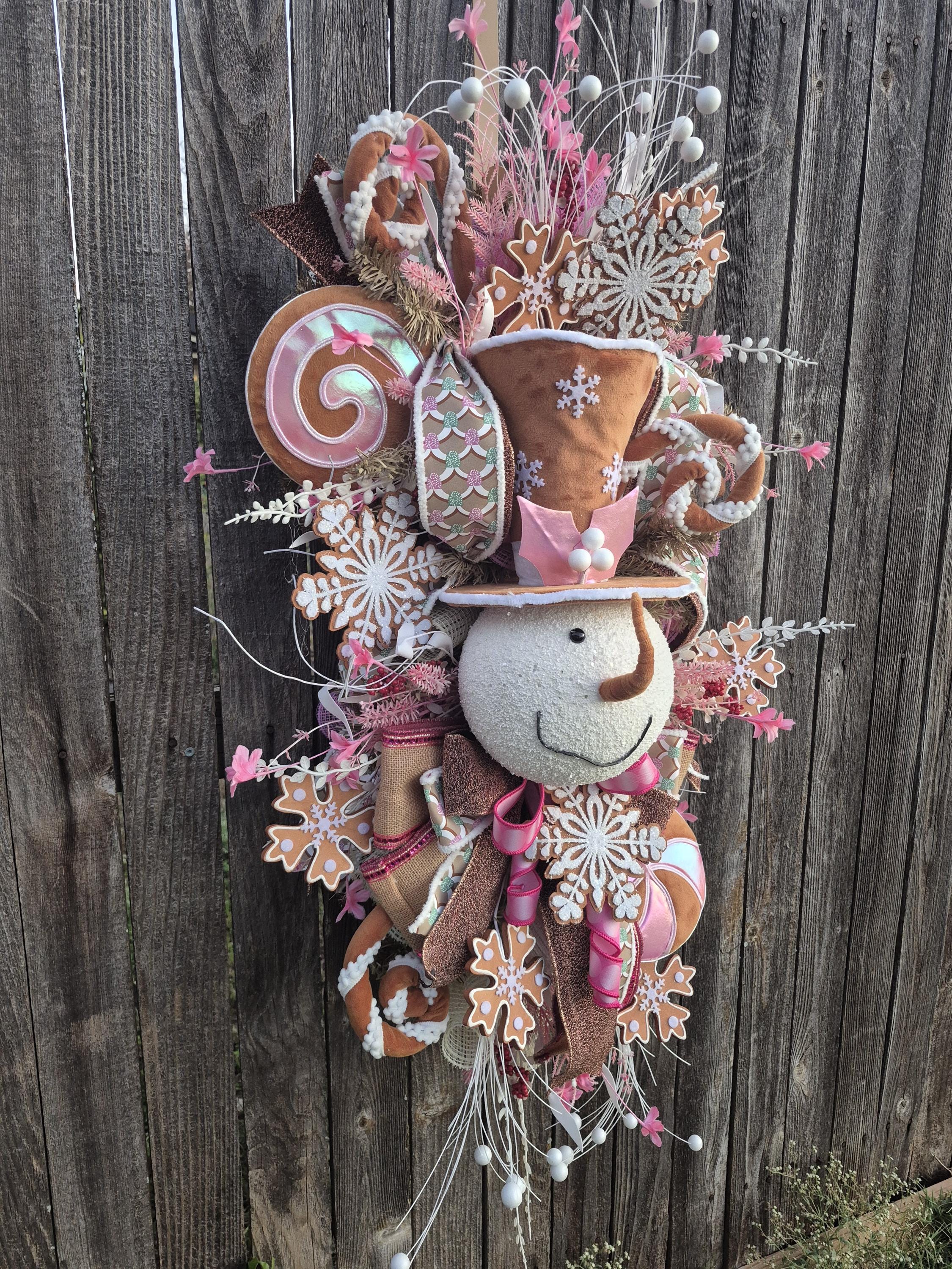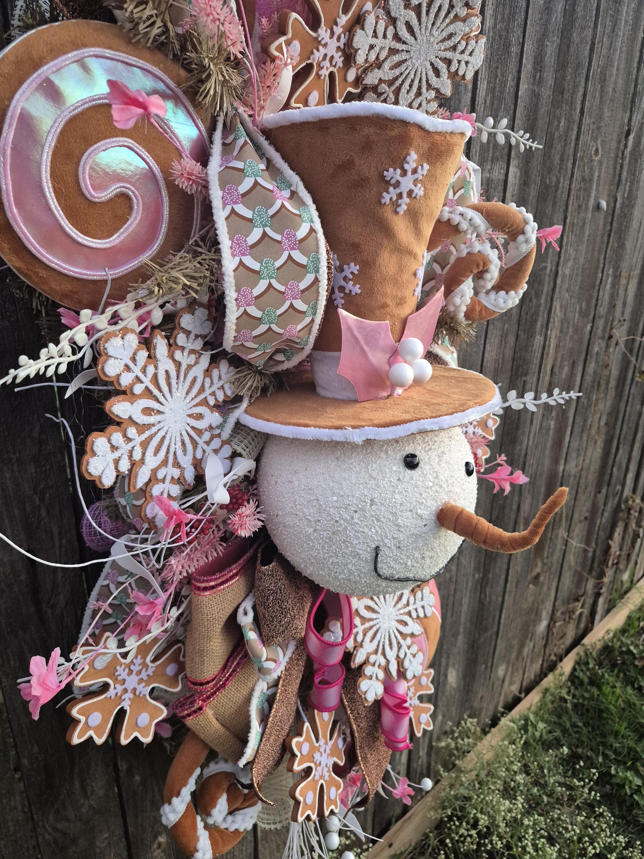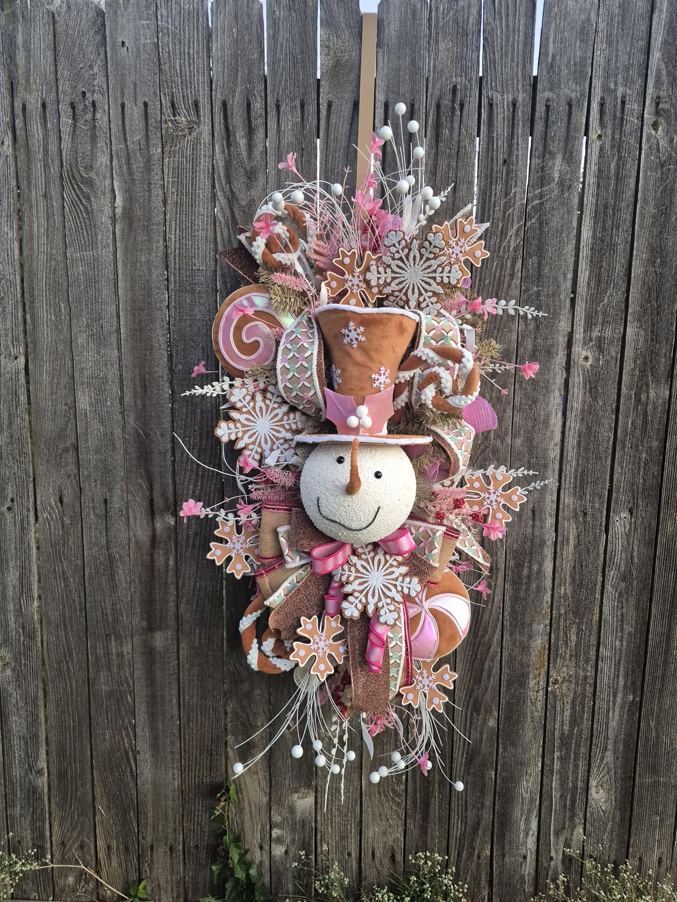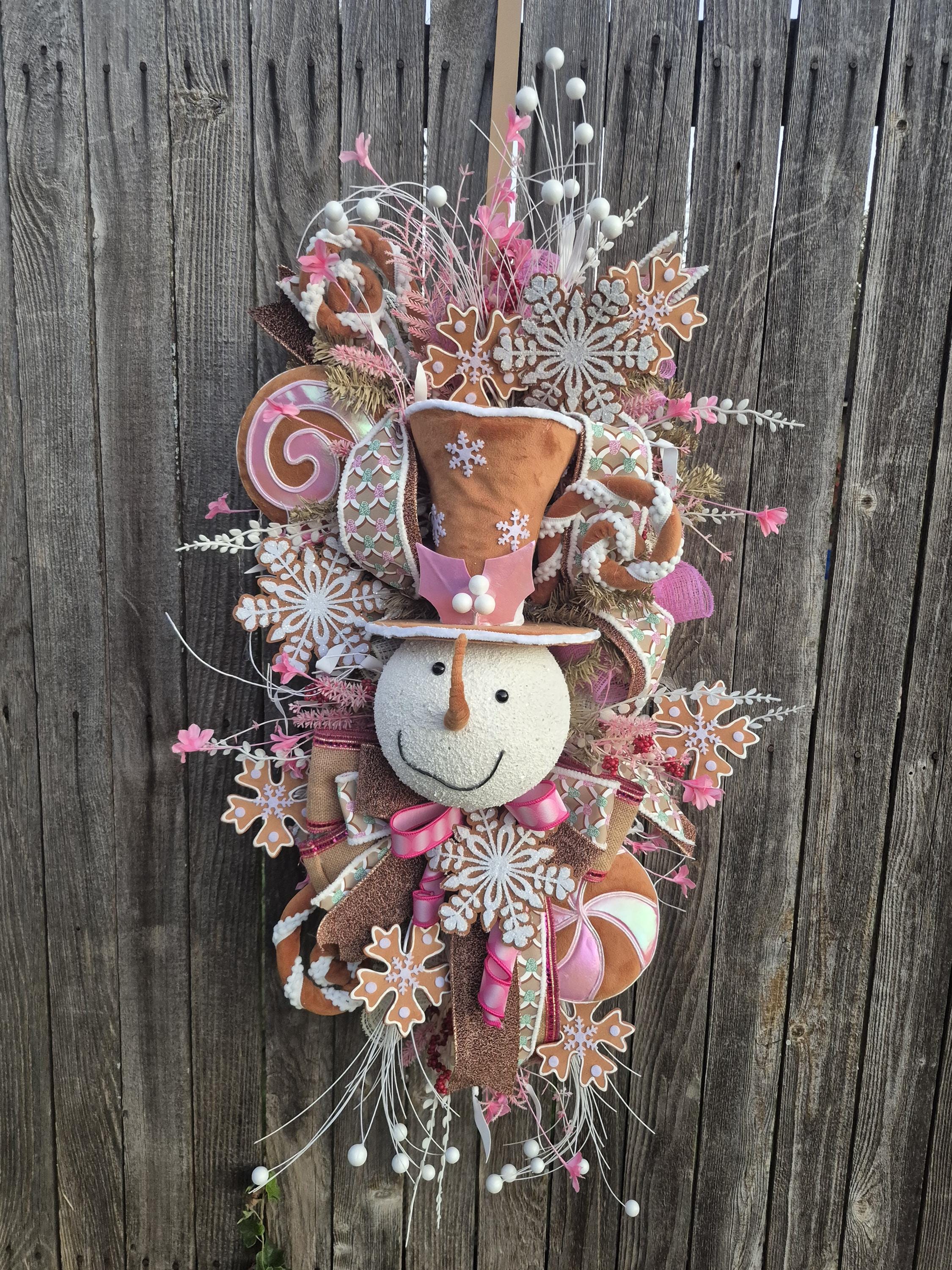 ✨ Details: - Handmade with love and attention to detail - Features a plush snowman surrounded by candy canes, peppermint swirls, gingerbread snowflakes, and festive ribbons - Vibrant color palette of pink, white, and brown for a unique holiday look - Designed on a swag base for a vertical, space-saving display - Perfect for front doors, mantels, or walls