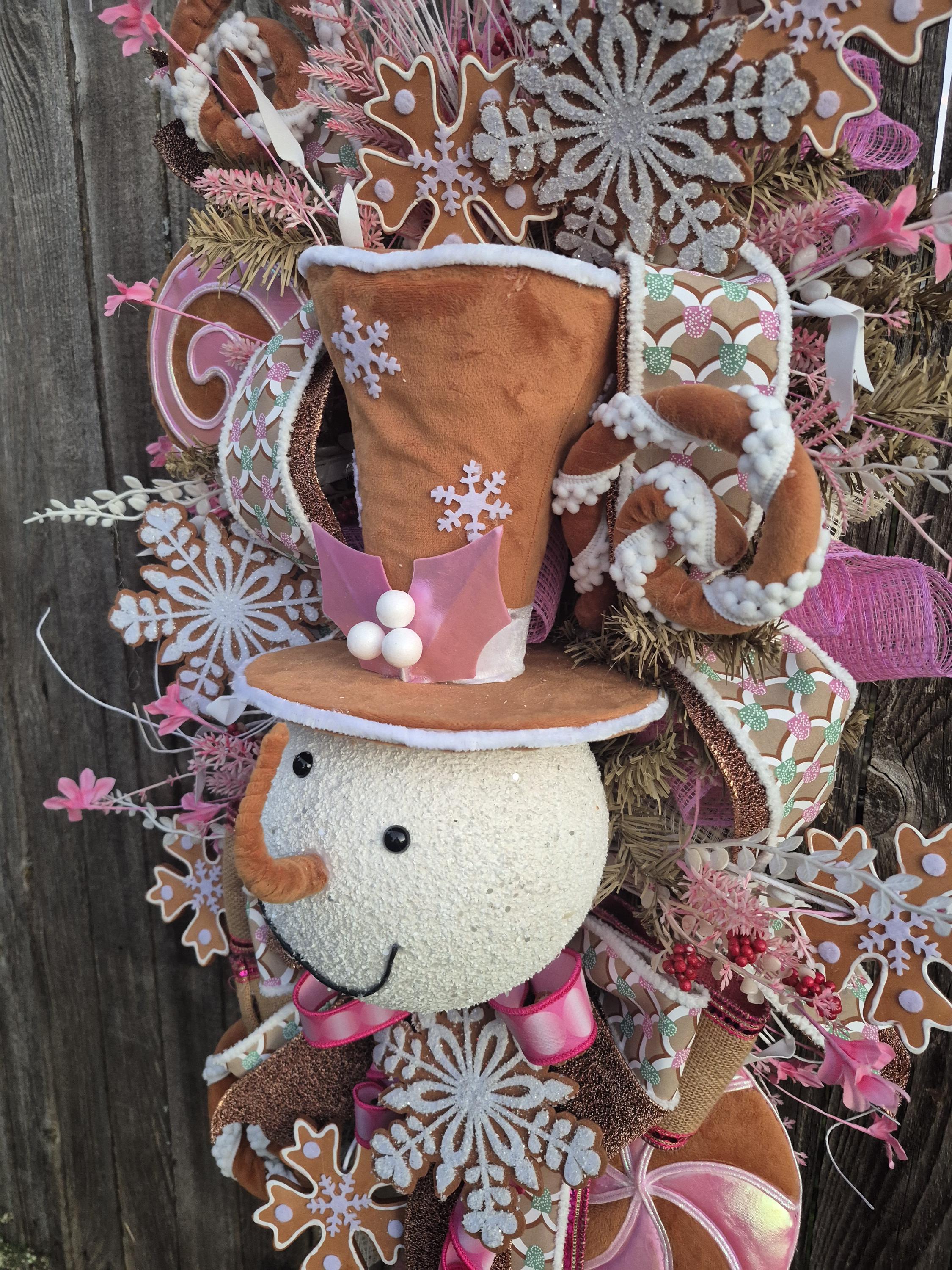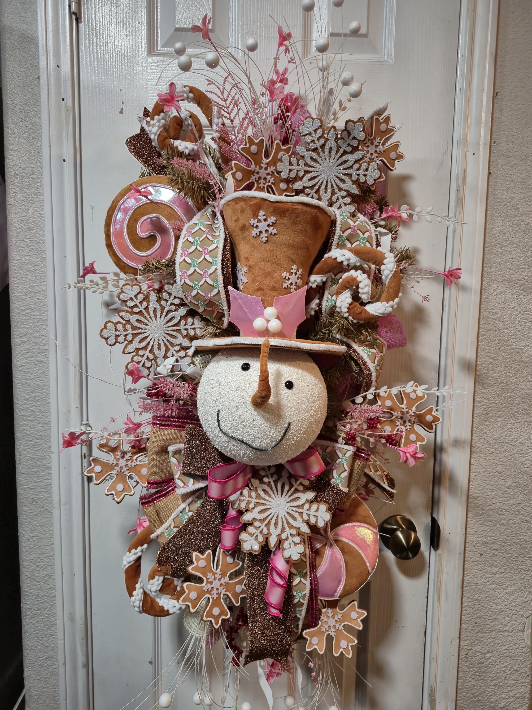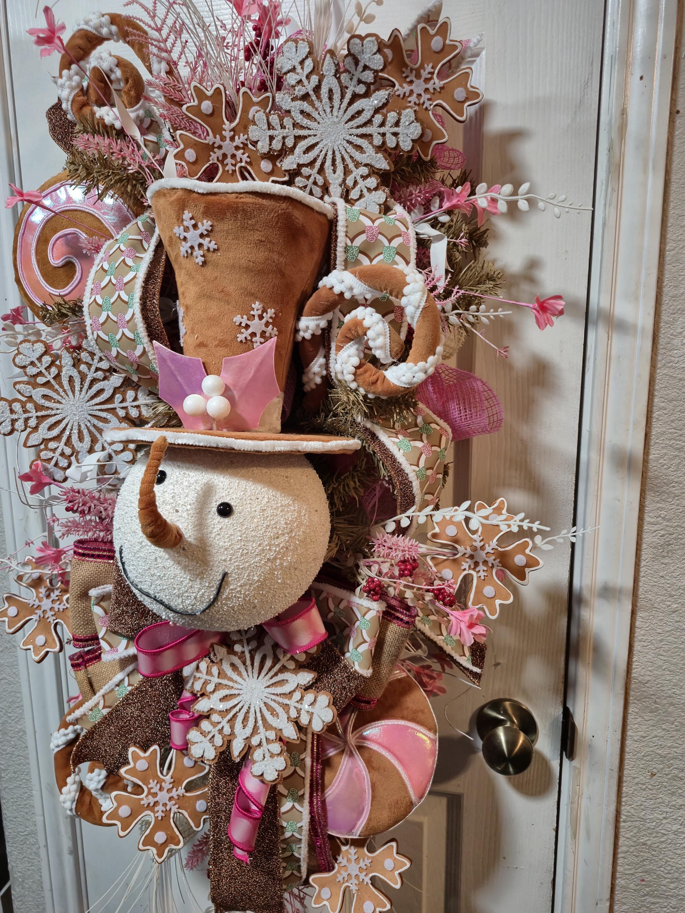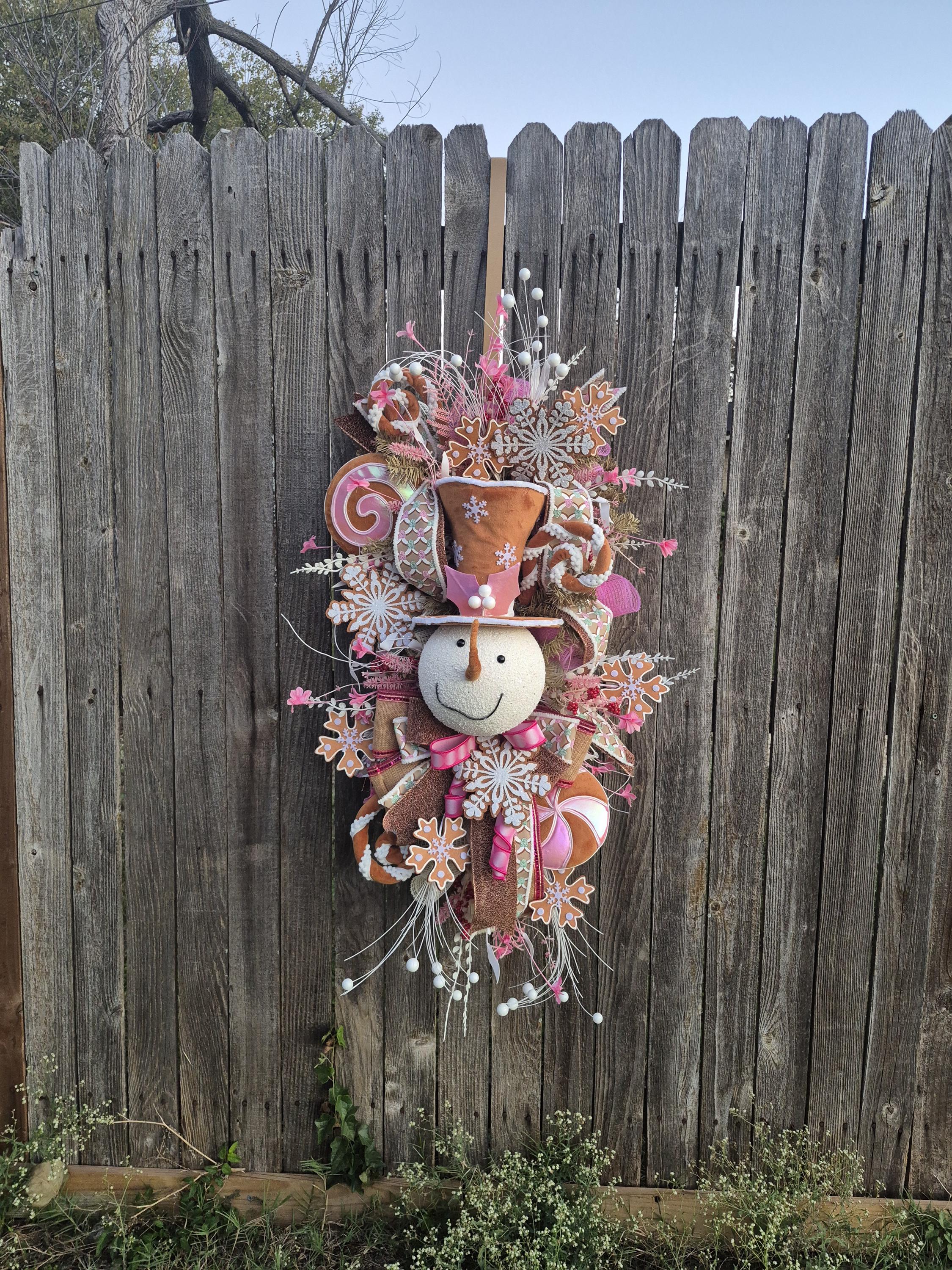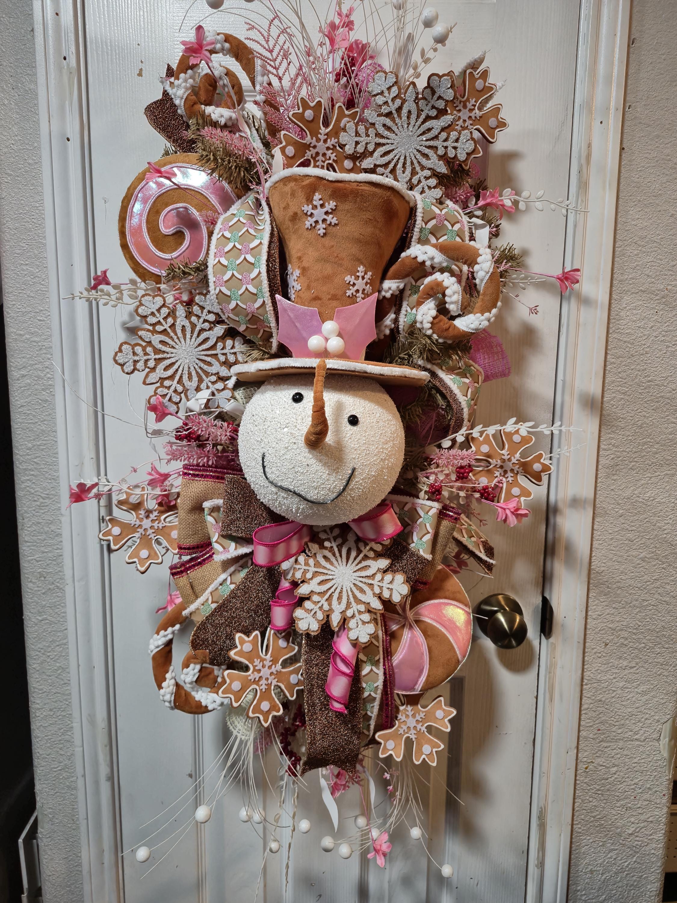 ✨ Details: - Handmade with love and attention to detail - Features a plush snowman surrounded by candy canes, peppermint swirls, gingerbread snowflakes, and festive ribbons - Vibrant color palette of pink, white, and brown for a unique holiday look - Designed on a swag base for a vertical, space-saving display - Perfect for front doors, mantels, or walls