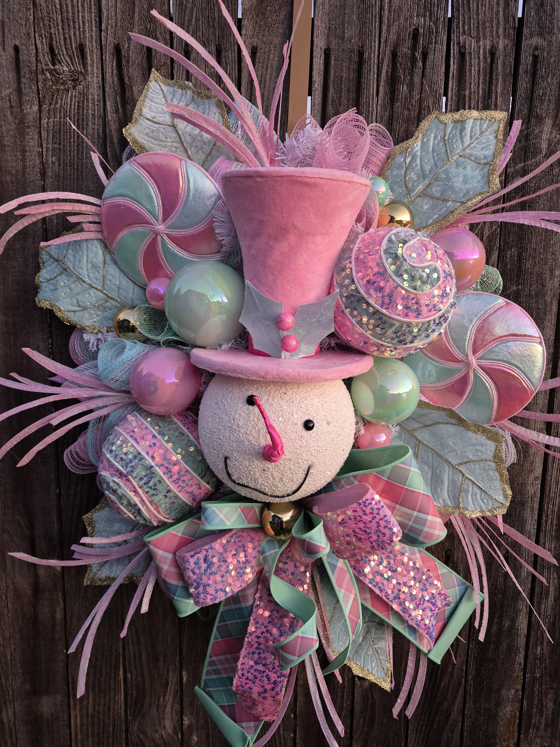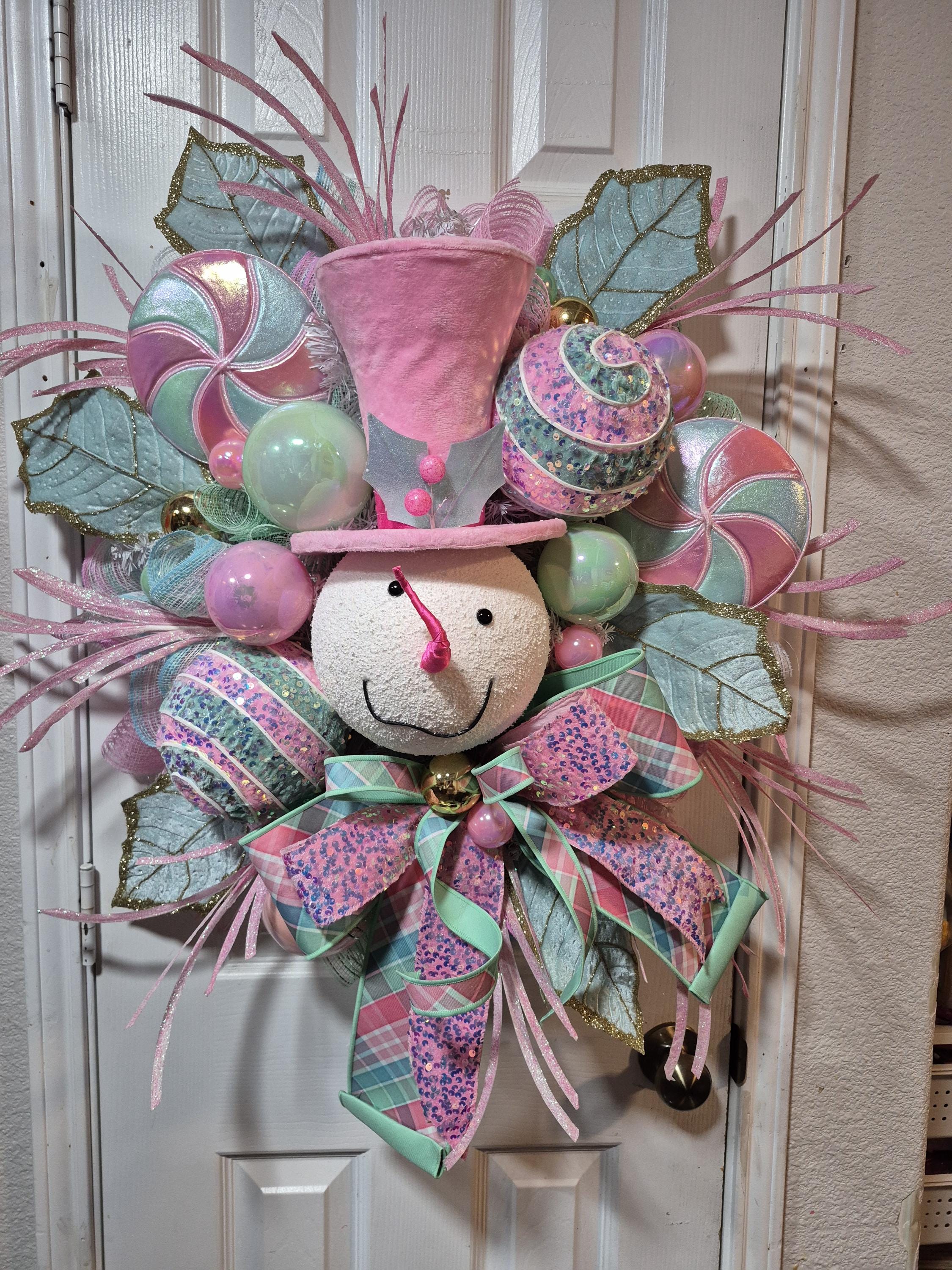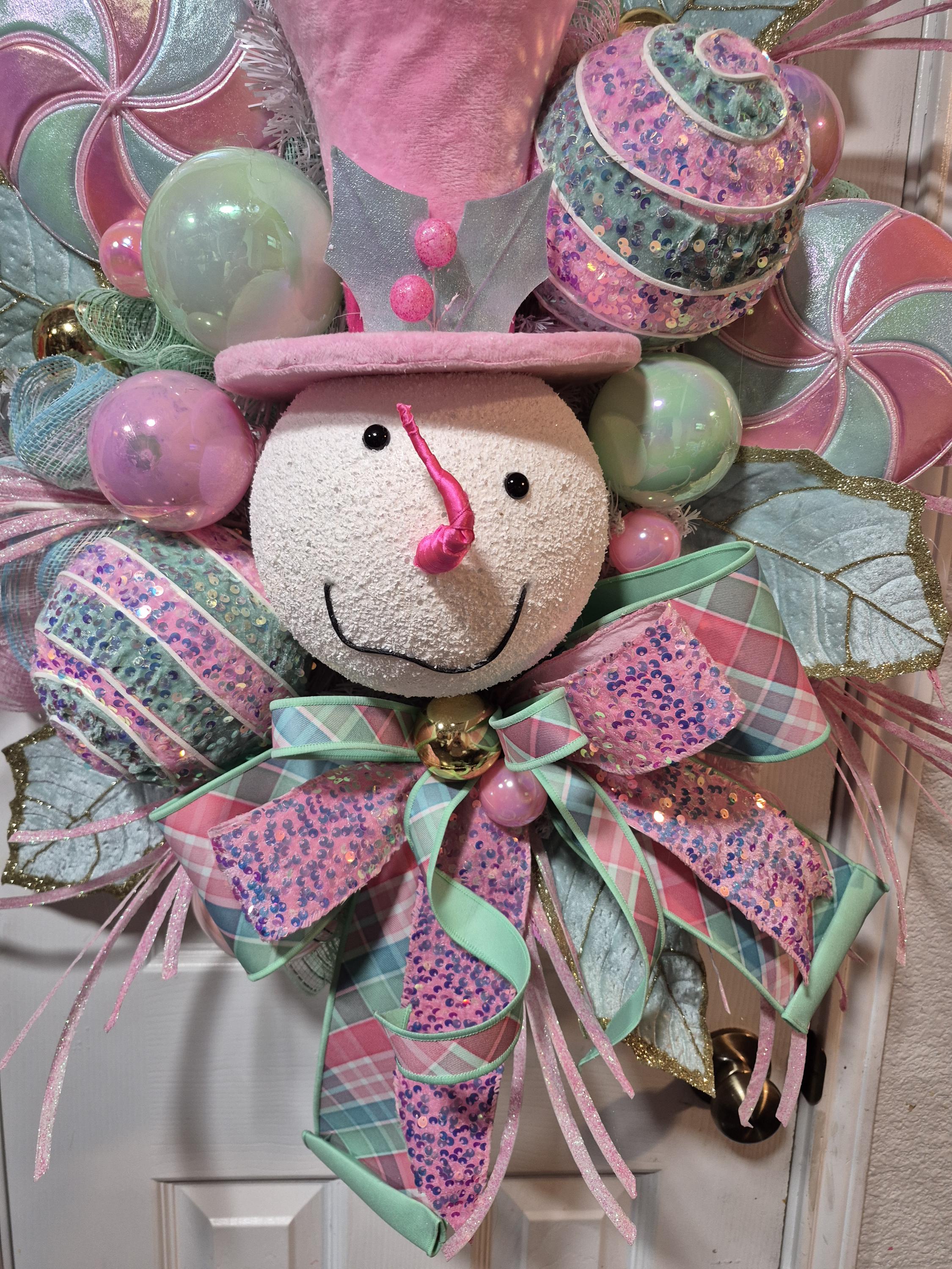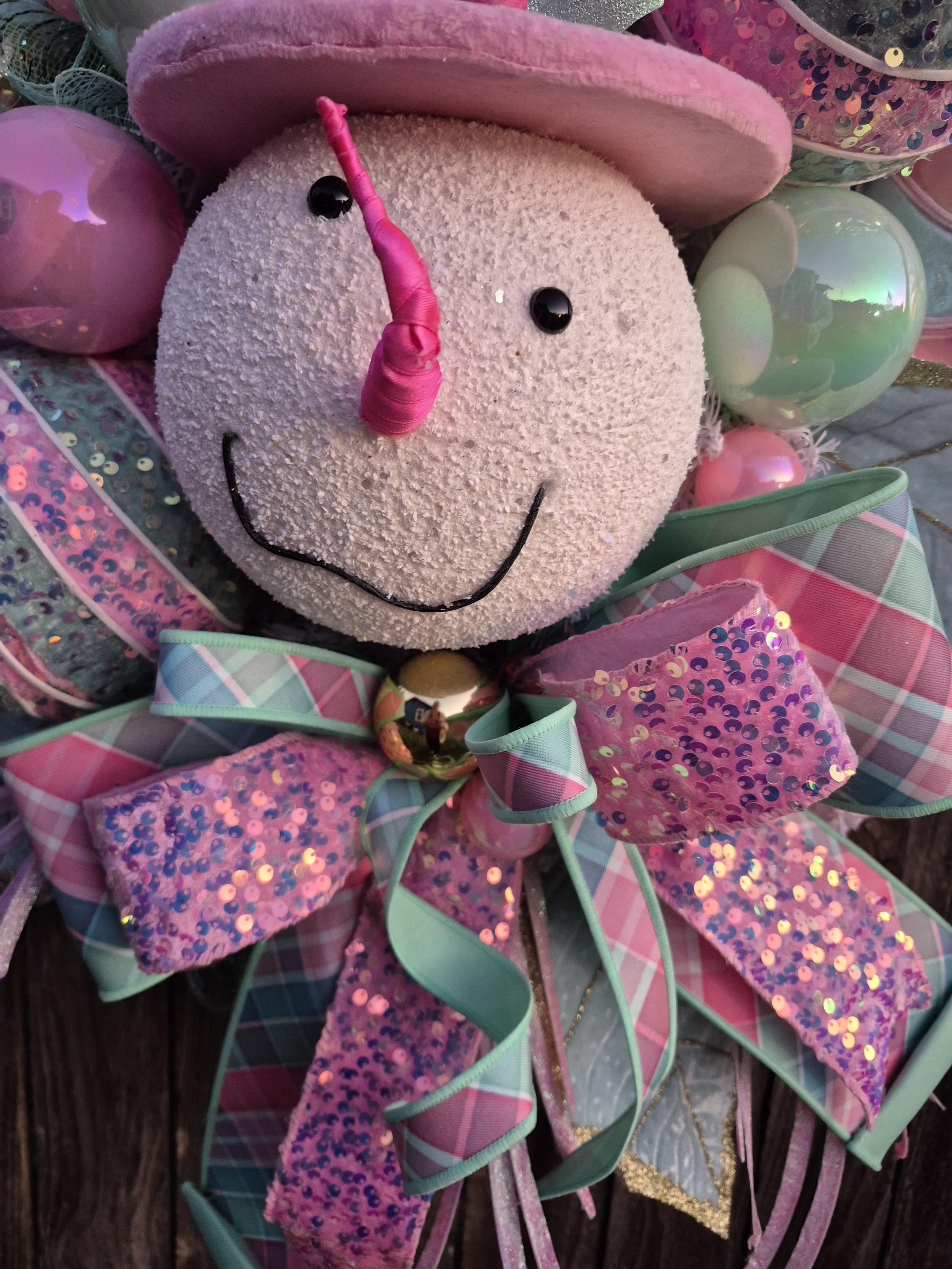 Add a sprinkle of sugarplum magic to your holiday decor with this handcrafted pastel snowman wreath! Featuring a cheerful snowman face with a pink carrot nose, glittery black eyes, and a sweet smile, this festive piece is bursting with charm. A pink velvet top hat adorned with holly leaves crowns the design, surrounded by oversized sequin pastel ornaments in mint, and pink, glittered leaves, and playful ribbon bows in plaid and sequin textures.