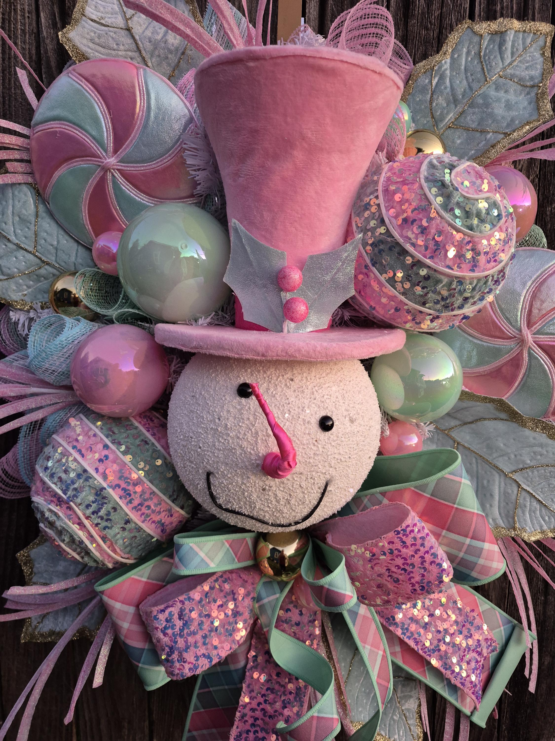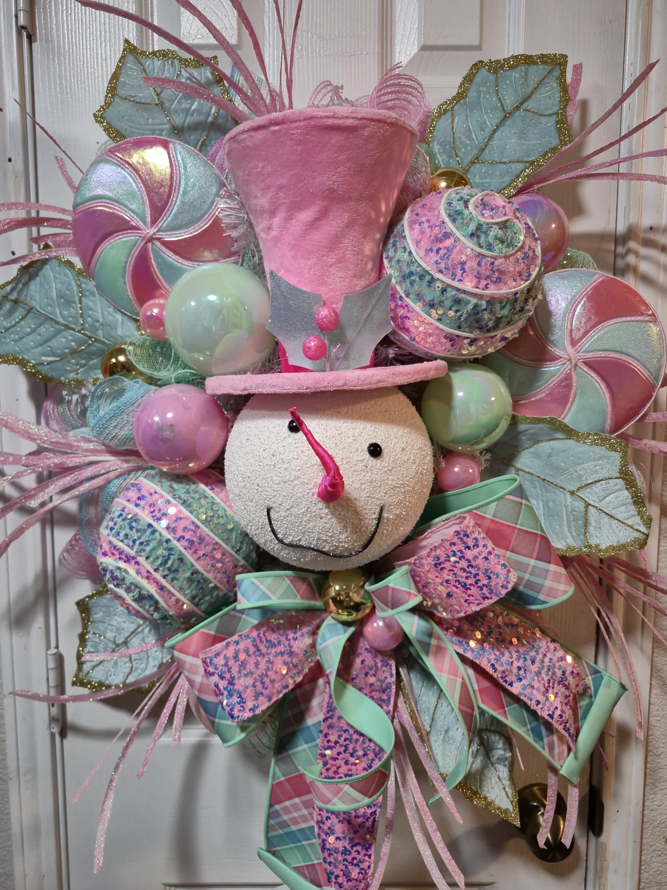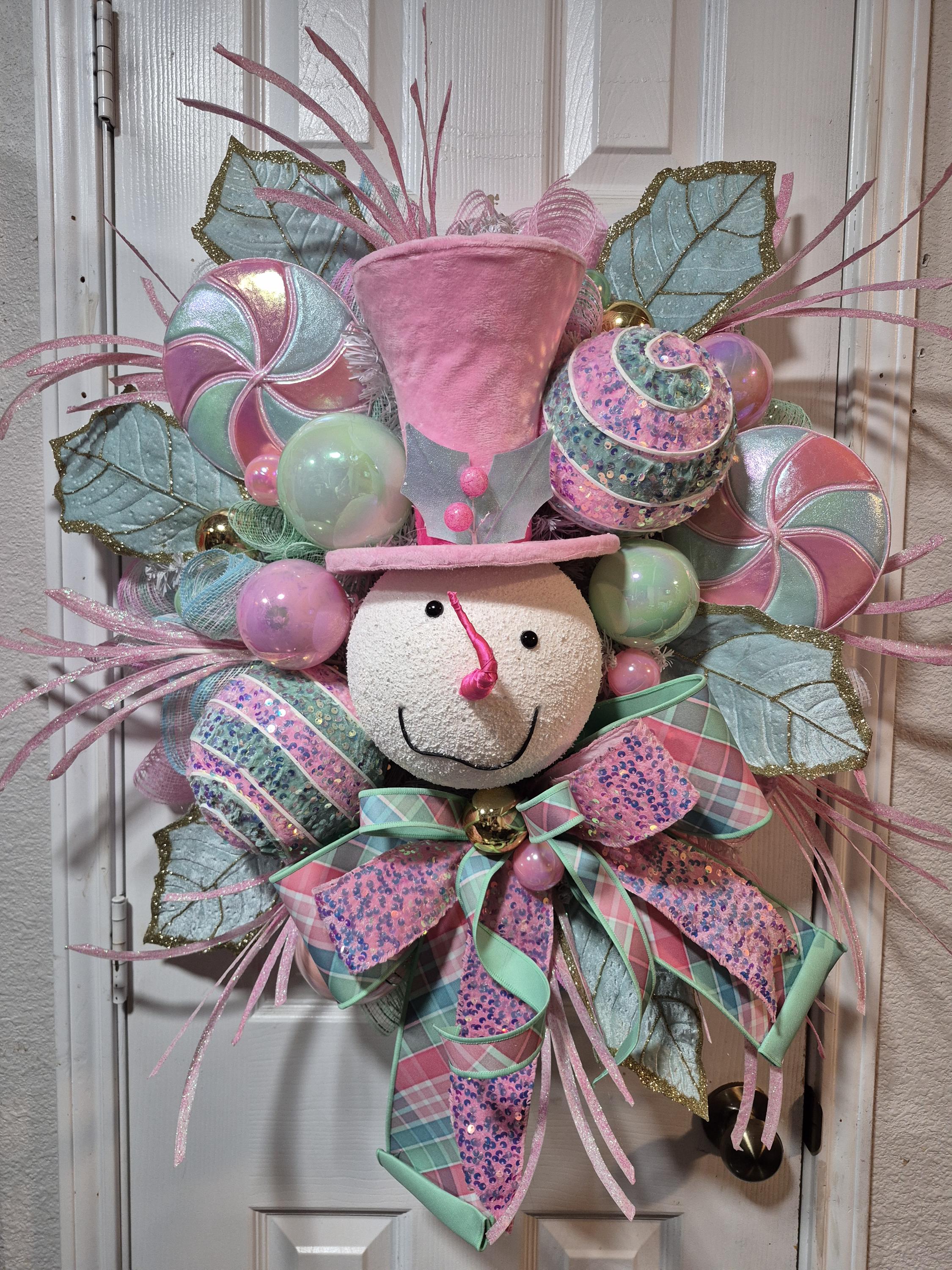 Add a sprinkle of sugarplum magic to your holiday decor with this handcrafted pastel snowman wreath! Featuring a cheerful snowman face with a pink carrot nose, glittery black eyes, and a sweet smile, this festive piece is bursting with charm. A pink velvet top hat adorned with holly leaves crowns the design, surrounded by oversized sequin pastel ornaments in mint, and pink, glittered leaves, and playful ribbon bows in plaid and sequin textures.