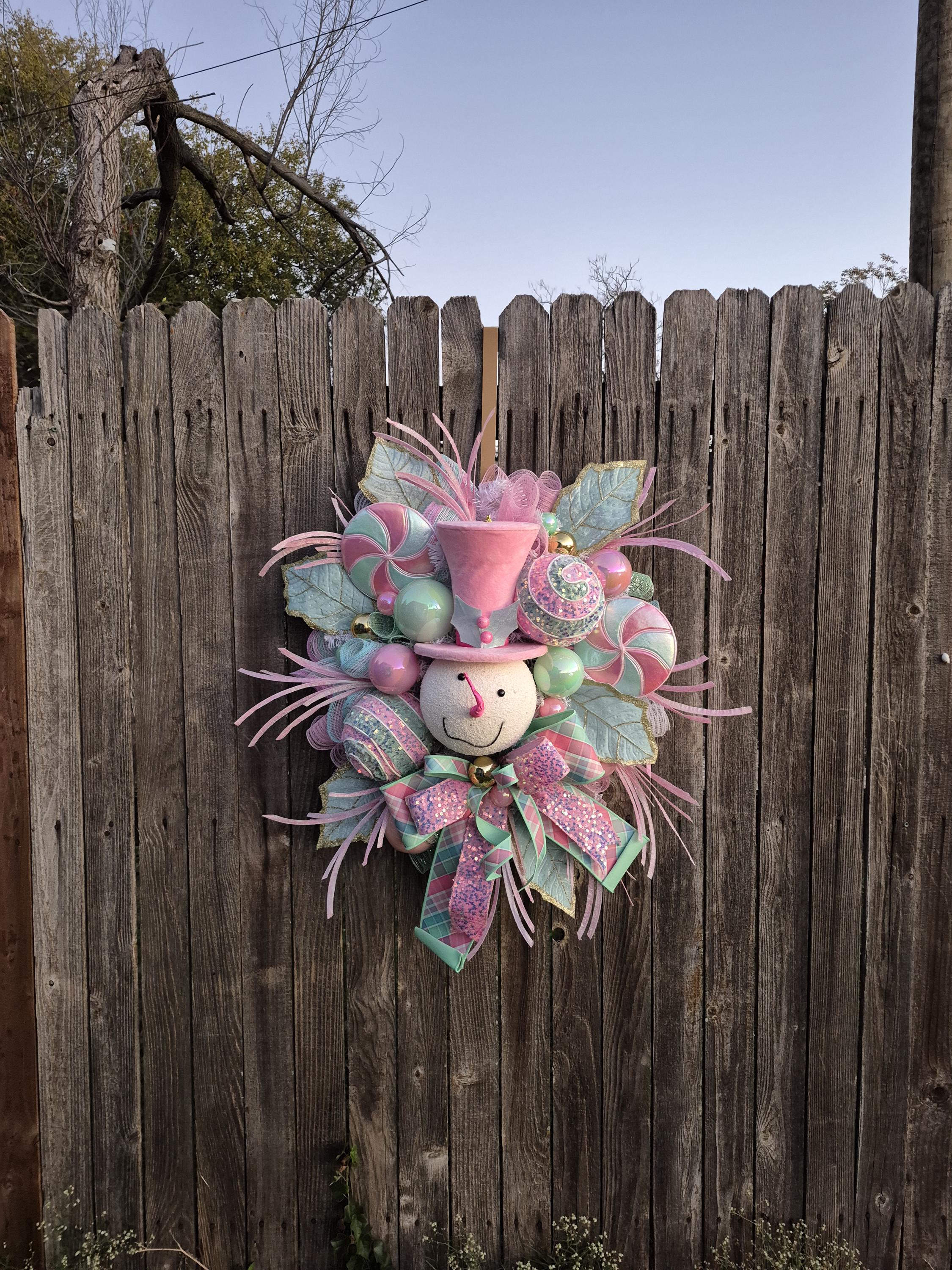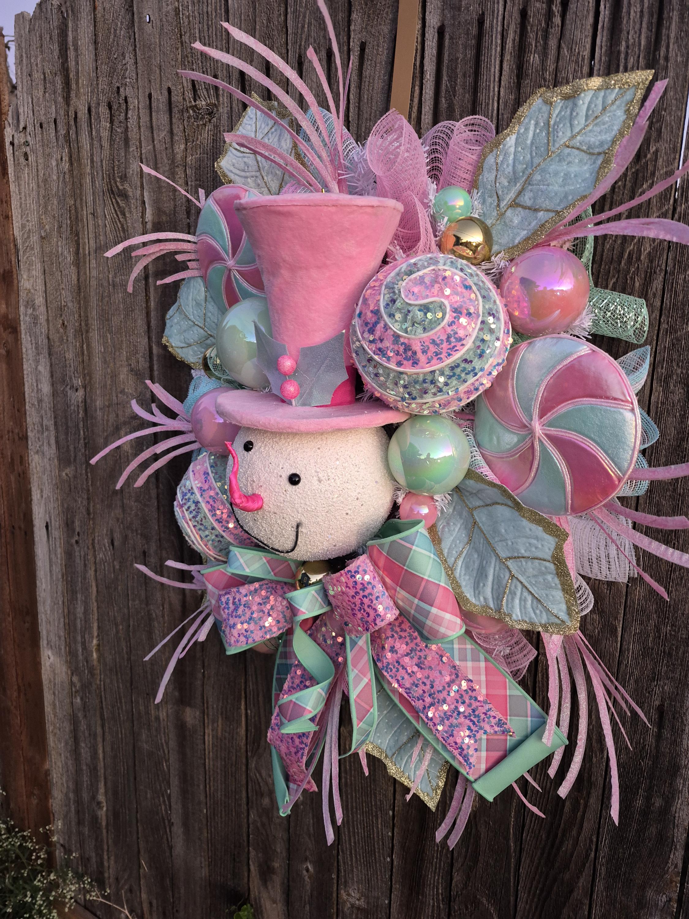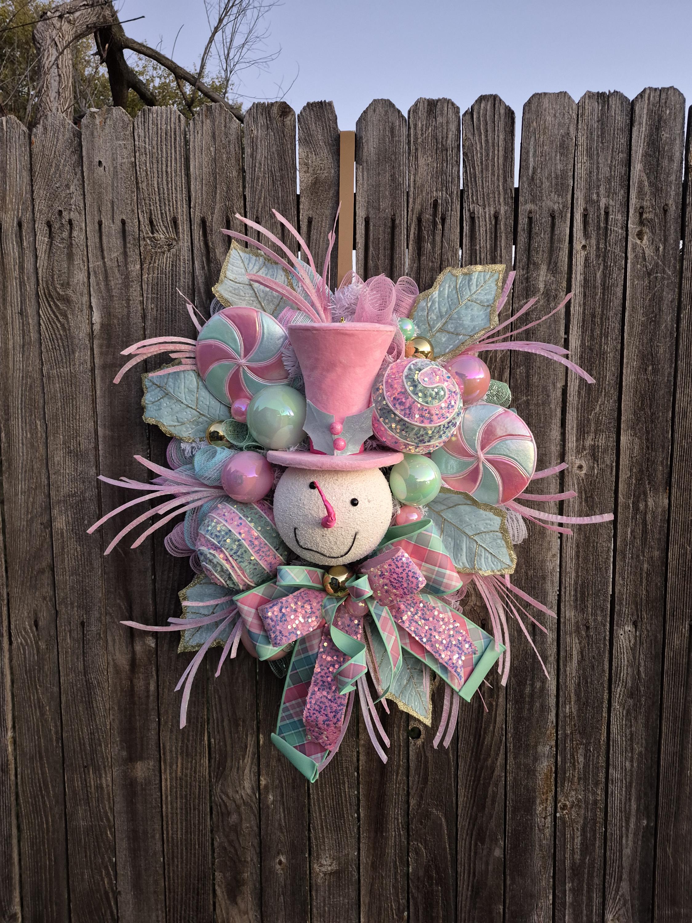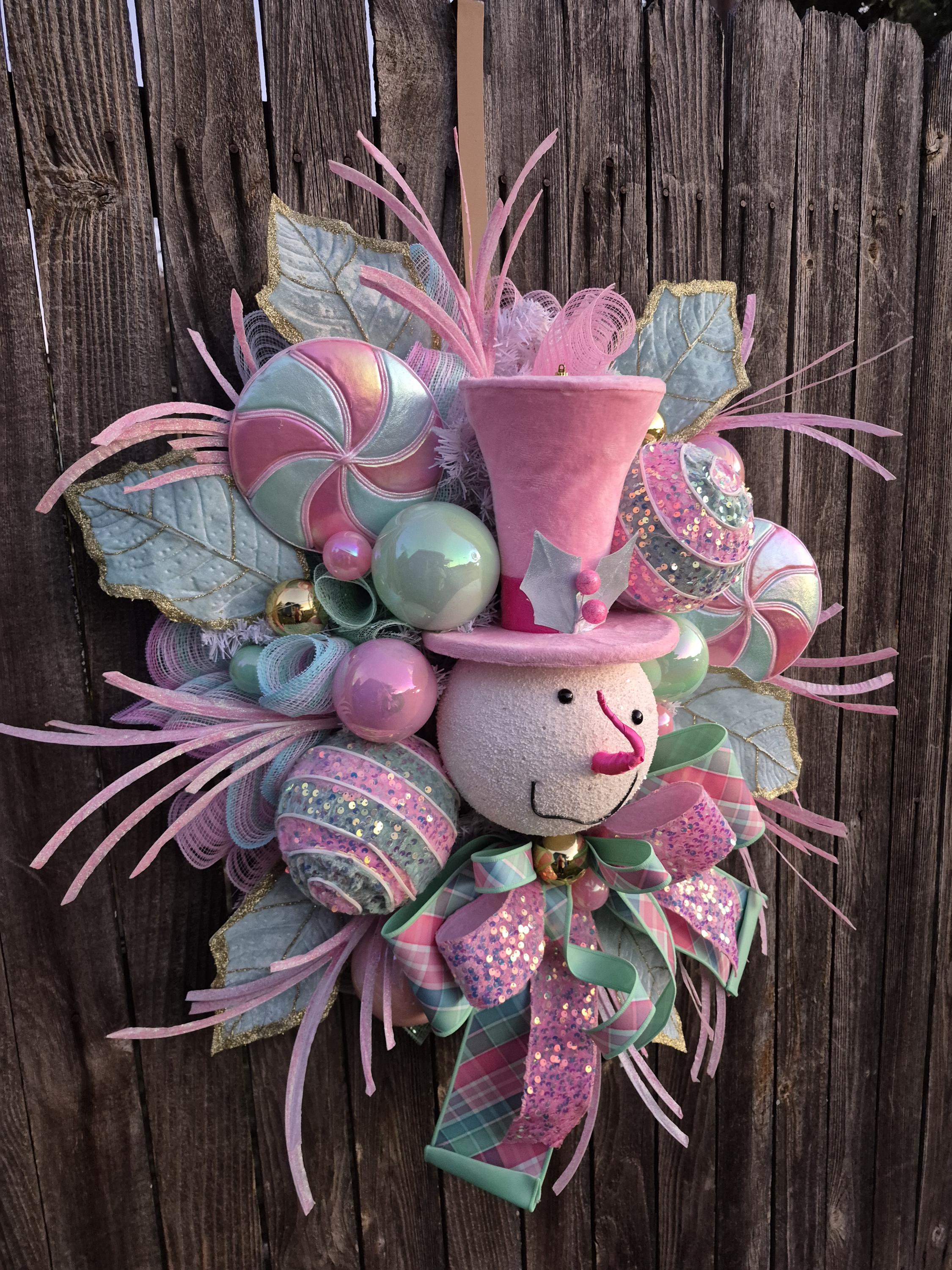 Add a sprinkle of sugarplum magic to your holiday decor with this handcrafted pastel snowman wreath! Featuring a cheerful snowman face with a pink carrot nose, glittery black eyes, and a sweet smile, this festive piece is bursting with charm. A pink velvet top hat adorned with holly leaves crowns the design, surrounded by oversized sequin pastel ornaments in mint, and pink, glittered leaves, and playful ribbon bows in plaid and sequin textures.