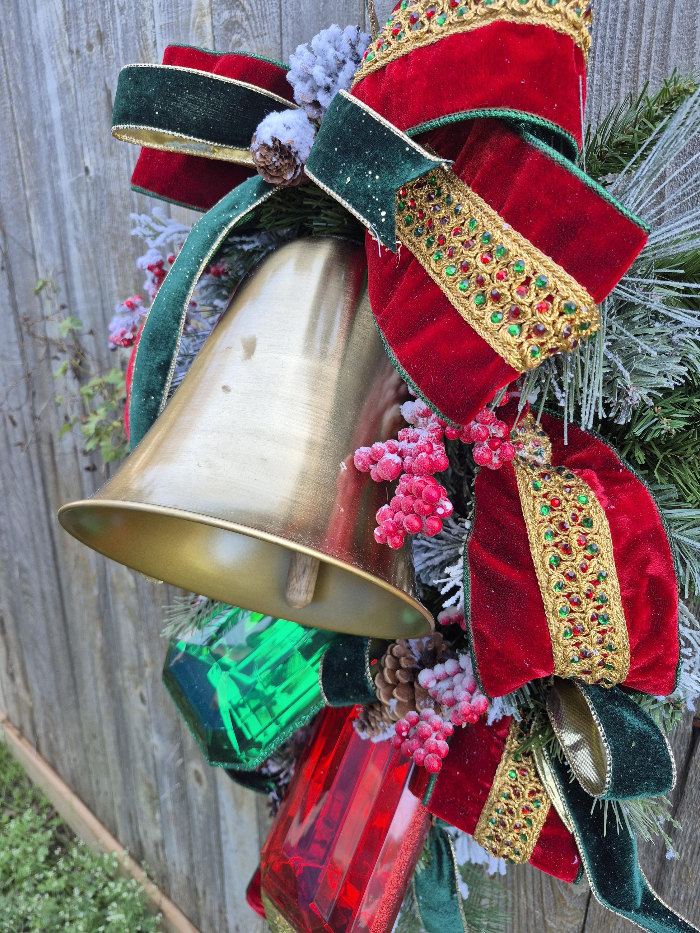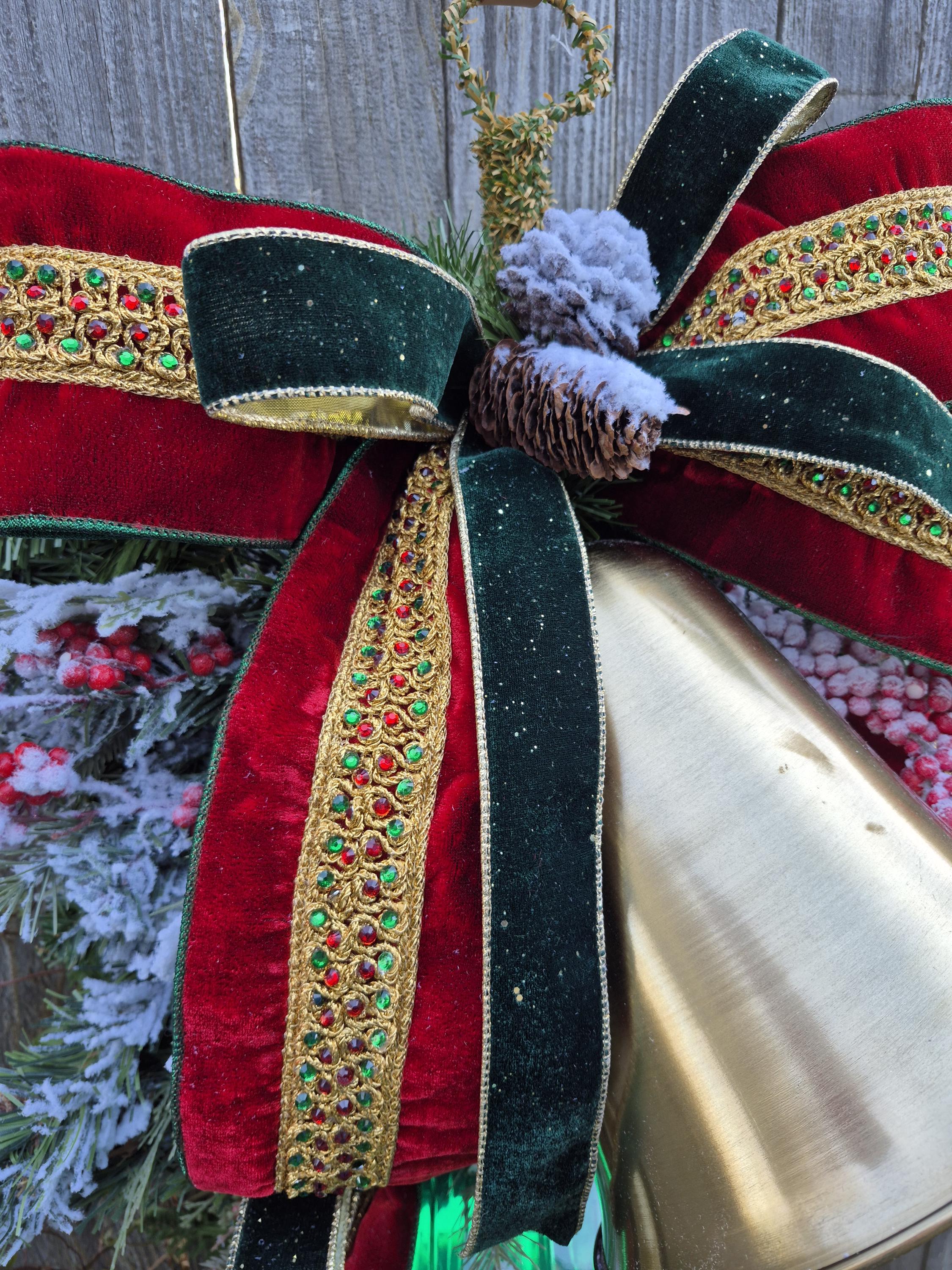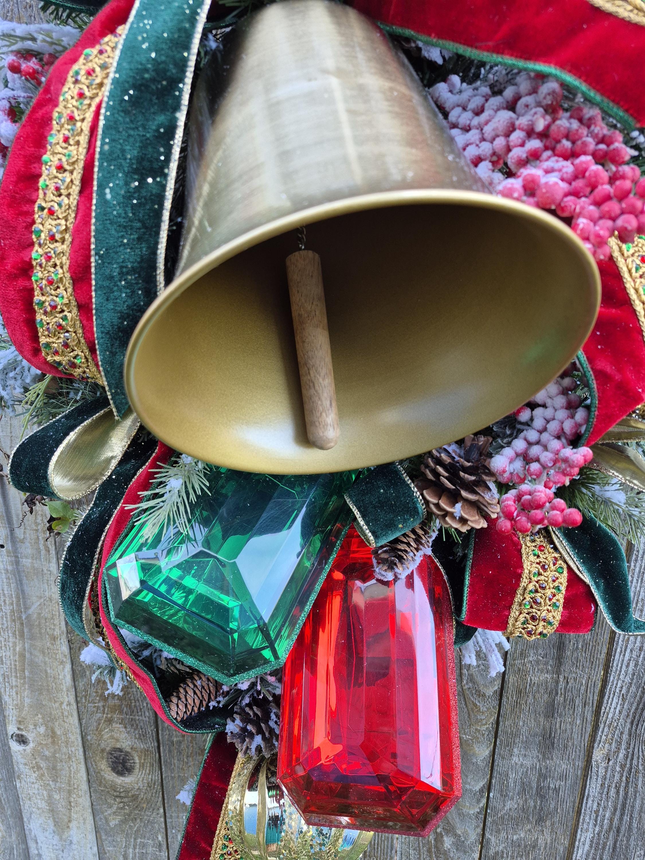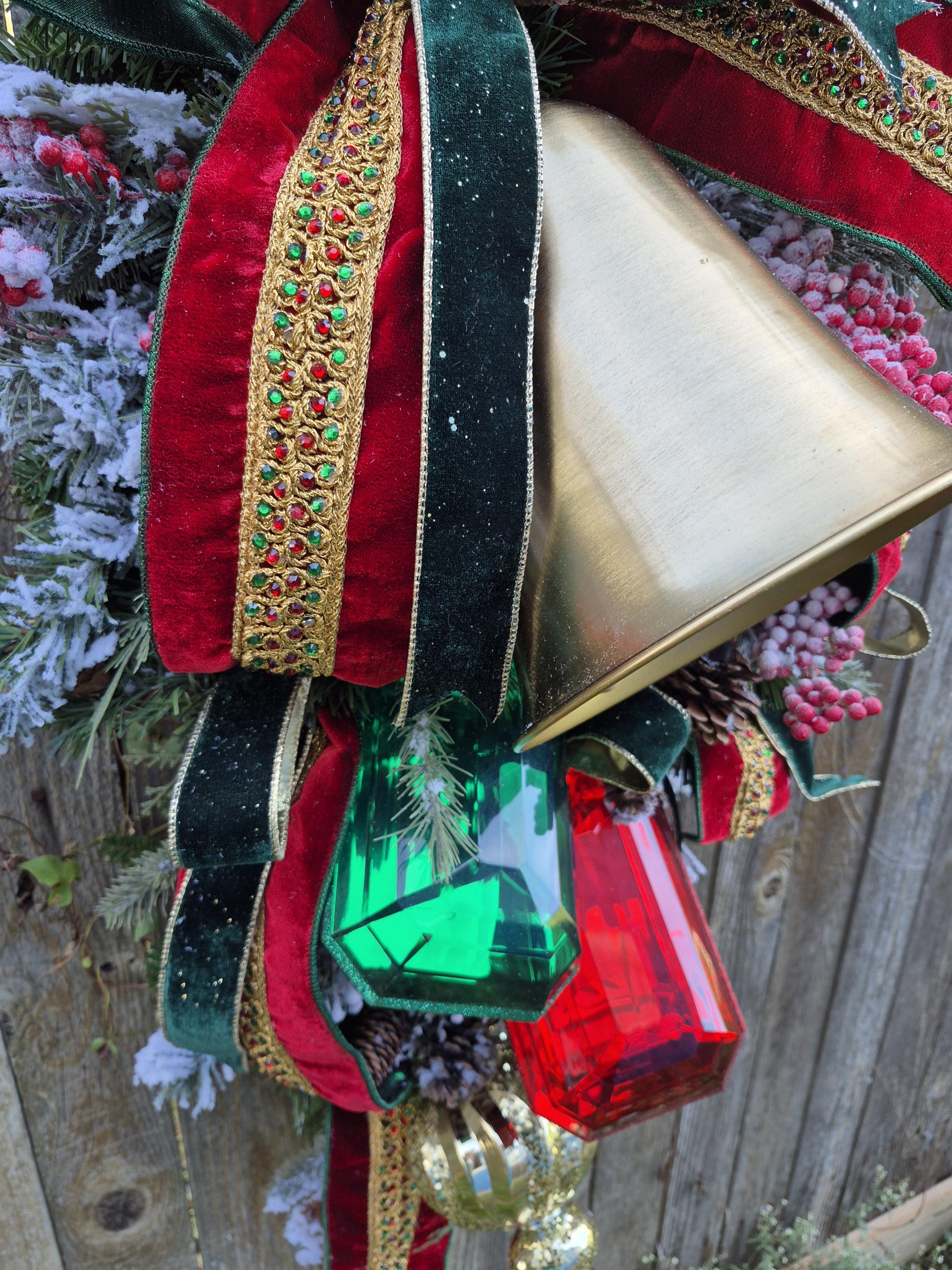 Celebrate the season with timeless charm! This handcrafted pine swag brings classic Christmas beauty to your home with luxurious details and festive sparkle. At the heart of the design is a large golden bell, surrounded by velvety red and green ribbons trimmed in gold, faceted gemstone ornaments, frosted berries, and snow-kissed pinecones. The lush greenery and regal accents create a warm, welcoming statement for your door, mantle, or wall.
