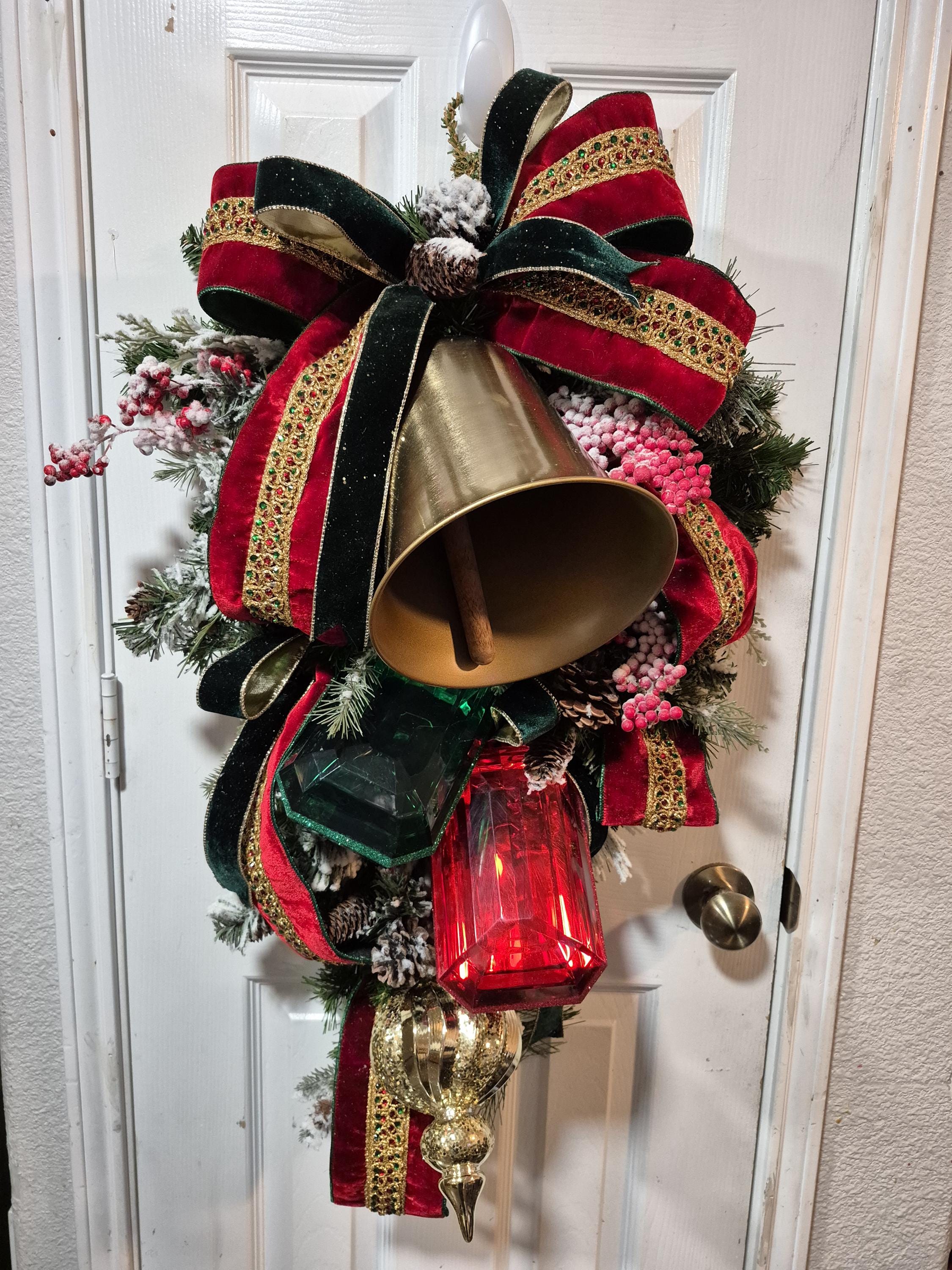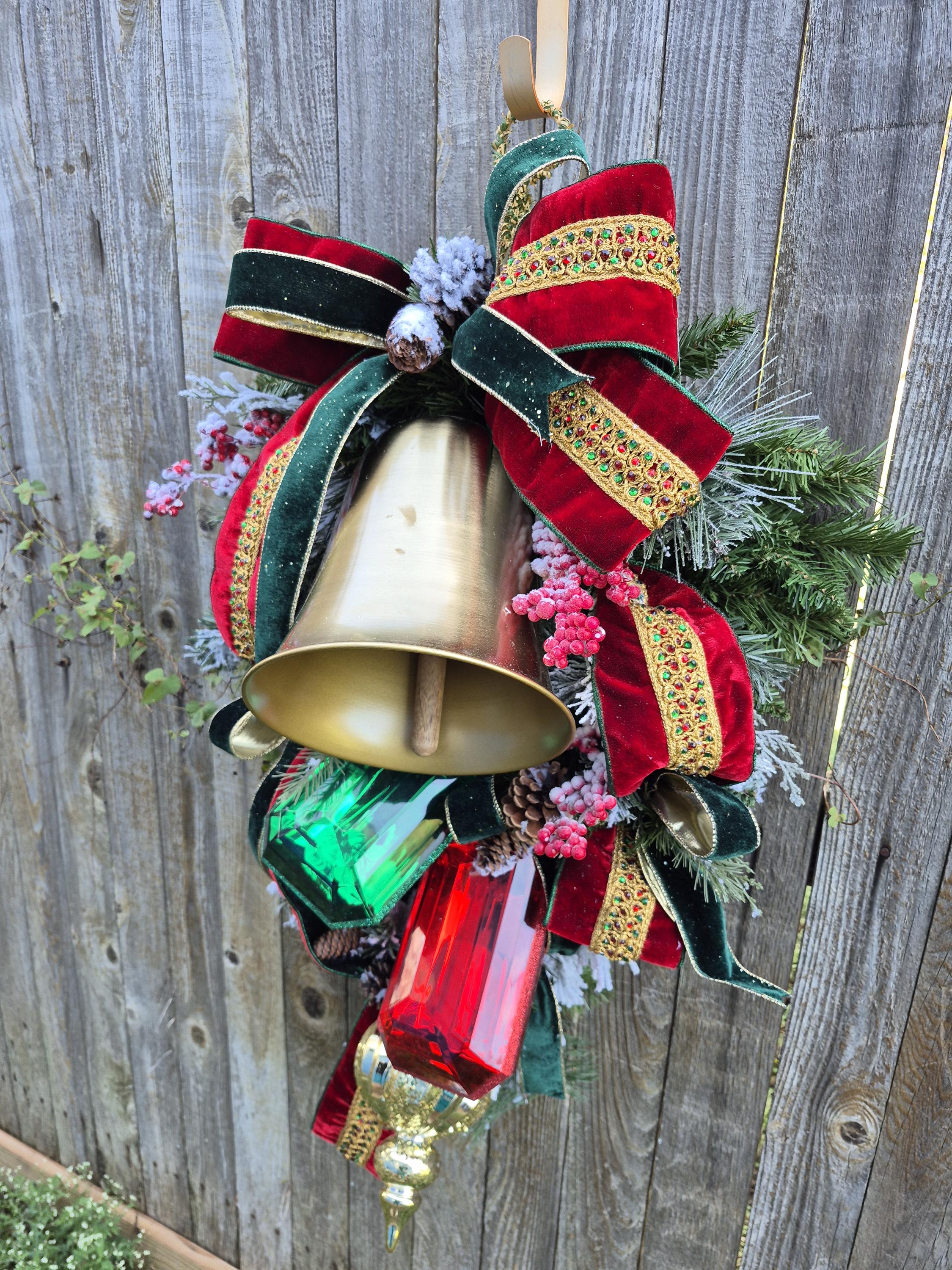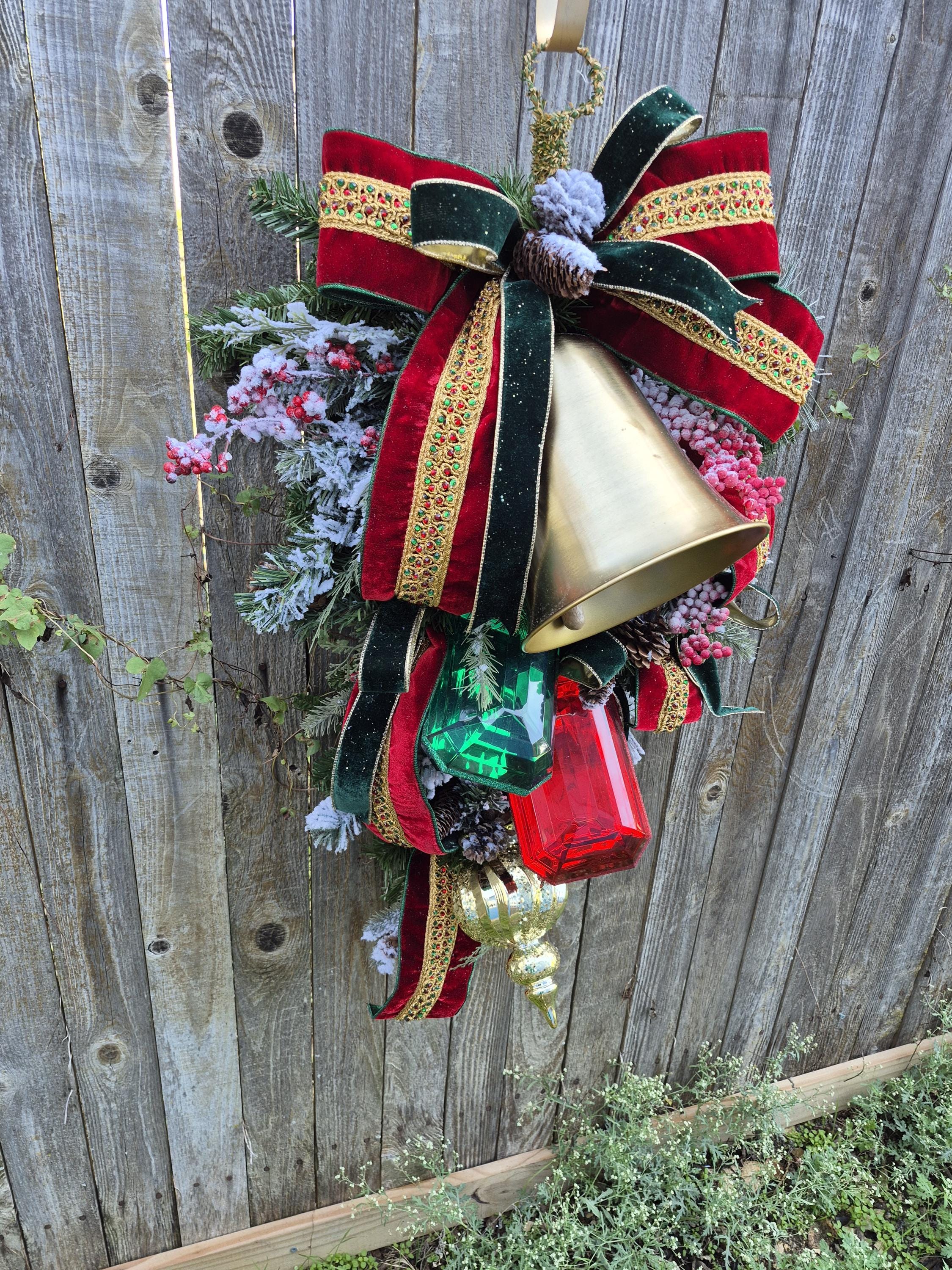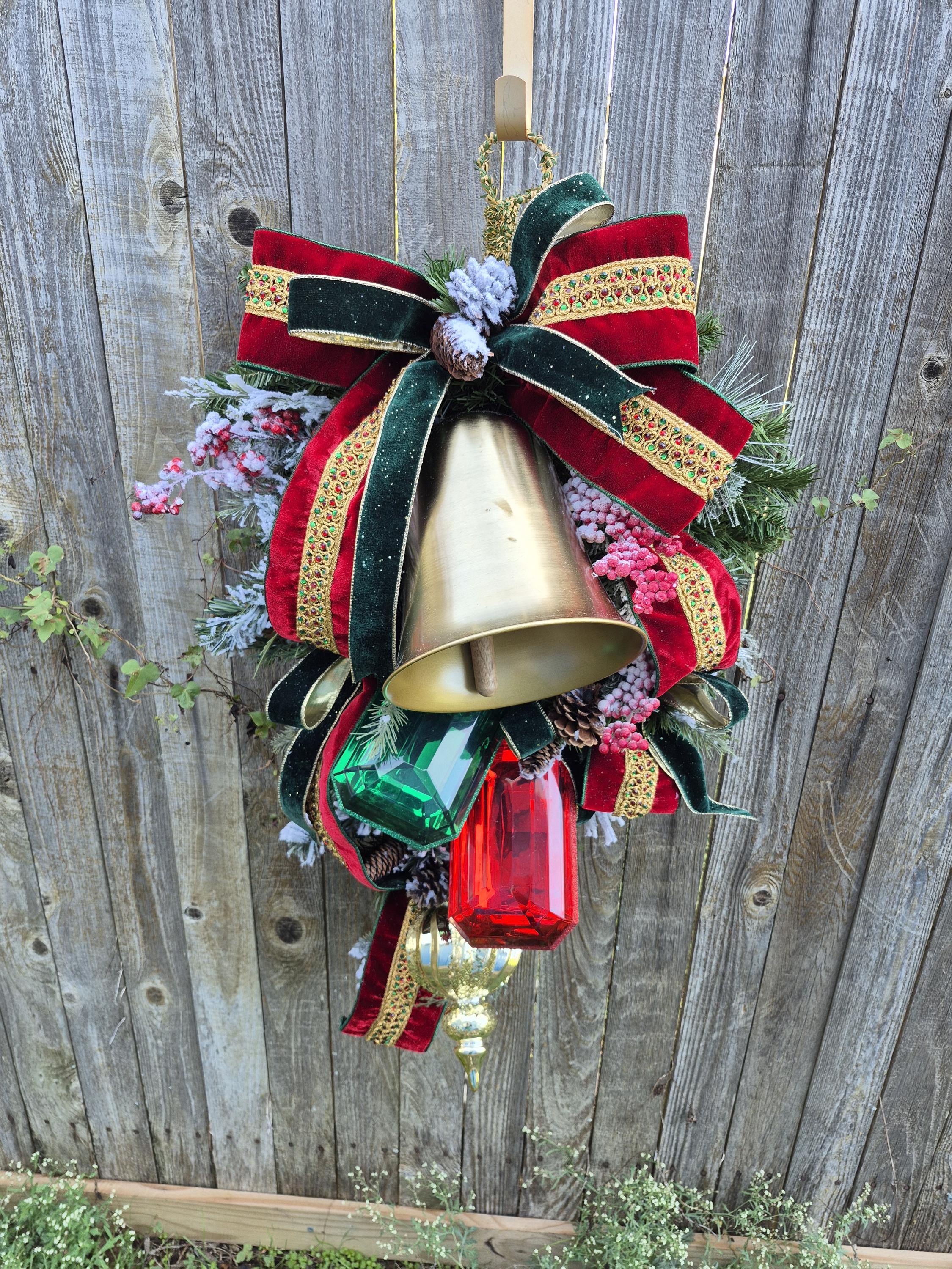 Celebrate the season with timeless charm! This handcrafted pine swag brings classic Christmas beauty to your home with luxurious details and festive sparkle. At the heart of the design is a large golden bell, surrounded by velvety red and green ribbons trimmed in gold, faceted gemstone ornaments, frosted berries, and snow-kissed pinecones. The lush greenery and regal accents create a warm, welcoming statement for your door, mantle, or wall.